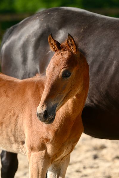 She is the third filly from our mare Pina Colada. Her oldest sister Moonlight Warrior is jumping 140 classes, second one Je T'Aime Ramira was started this year and is looking very easy and promising. They all are brave, forward thinking without being sharp and long term sound.